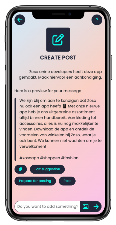 De focus lag op een soepele technische uitvoering, zodat gebruikers direct aan de slag kunnen. Tijdens de ontwikkeling zorgden we dat de app niet alleen functioneel werkt, maar ook vertrouwen en inspiratie uitstraalt. Op die manier voelt het voor ondernemers alsof ze een digitale contentbuddy in handen hebben die hen ondersteunt bij hun zichtbaarheid.