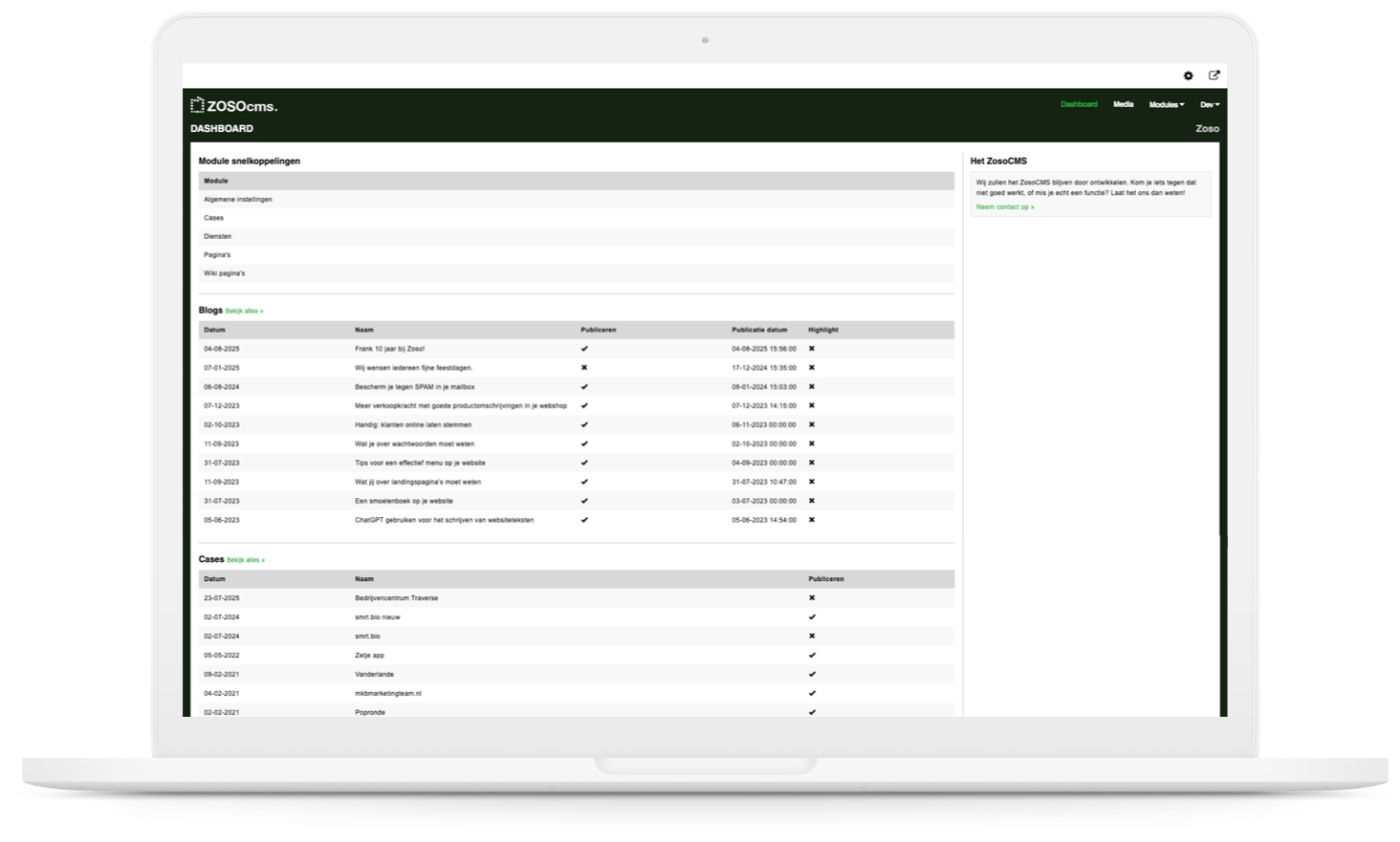 Bij Zoso vinden we het vanzelfsprekend dat iedere website die we bouwen beheerd kan worden door de klant zelf. Niemand wil immers afhankelijk zijn van een derde partij wanneer je iets wilt toevoegen of aanpassen op je website. Daarom ontwikkelden we ZosoCMS, een gebruiksvriendelijk contentmanagementsysteem waarmee zowel developers als klanten efficiënt kunnen werken.